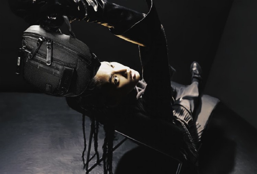 JUN身揹PORTER INTERNATIONAL NEW HEAT JET BLACK「重塑經典 雙層斜肩包」,包款低調簡約,獨具魅力,提供都市潮人全新搭配選擇。