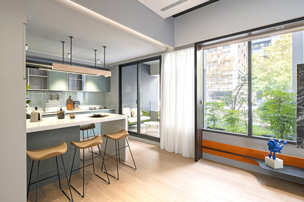 「大隱德芳」有市場少見的面寬型格局,餐廚客廳一線採光,此為樣品屋。