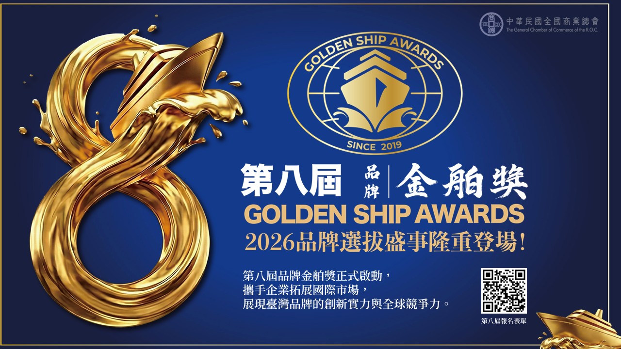 召集中小企業品牌,攜手拓展國際市場!由中華民國全國商業總會主辦的「品牌金舶獎」今年邁入第八屆,設立綠色永續組、國際拓展潛力組、服務創新組、海外僑臺商組四大組別,自即日起開放網路報名,書審資料繳交至2026年3月31日止。
