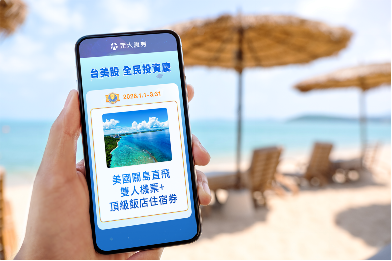 迎接2026投資開局,元大證券自2026年1月1日至3月31日推出「台美股 全民投資慶」,祭出關島雙人來回機票及住宿券、全台五星飯店住宿券,以及Gemini AI智慧手錶等總價值逾新臺幣60萬元豪禮。活動期間每天交易(含定期定額)即可累積抽獎次數,交易標的包含「台股個股」、「台股ETF」、「美股個股」、「美股ETF」,滿足投資人從存ETF到個股交易、從台股錢進美股市場的多元資產配置需求;除此之外,即日起至2026年12月31日,投資人還可享有美股交易免低消的手續費優惠,新開戶最高再領新臺幣1,688元台股電子交易手續費抵用金。