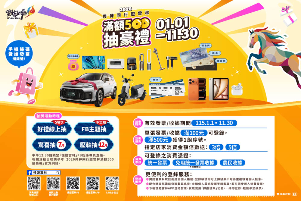 「2026 與神同行遊雲林滿額 500抽豪禮」活動自115年1月1日起至11月30日止,今年除了匯入雲端發票之外,更結合「慢遊雲林 APP」新增發票掃描功能,手機掃描即可快速完成登錄,流程更簡單、參加更便利。