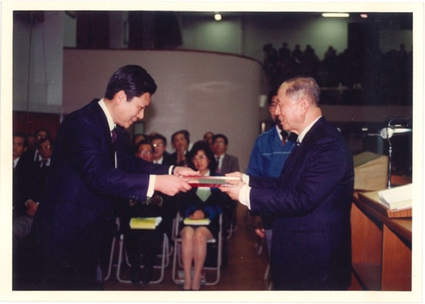 永隆鋁業董事長郭清松(圖左)從大同公司董事長林挺生(圖右)手中,獲頒大同電鍋優良協力廠商。
